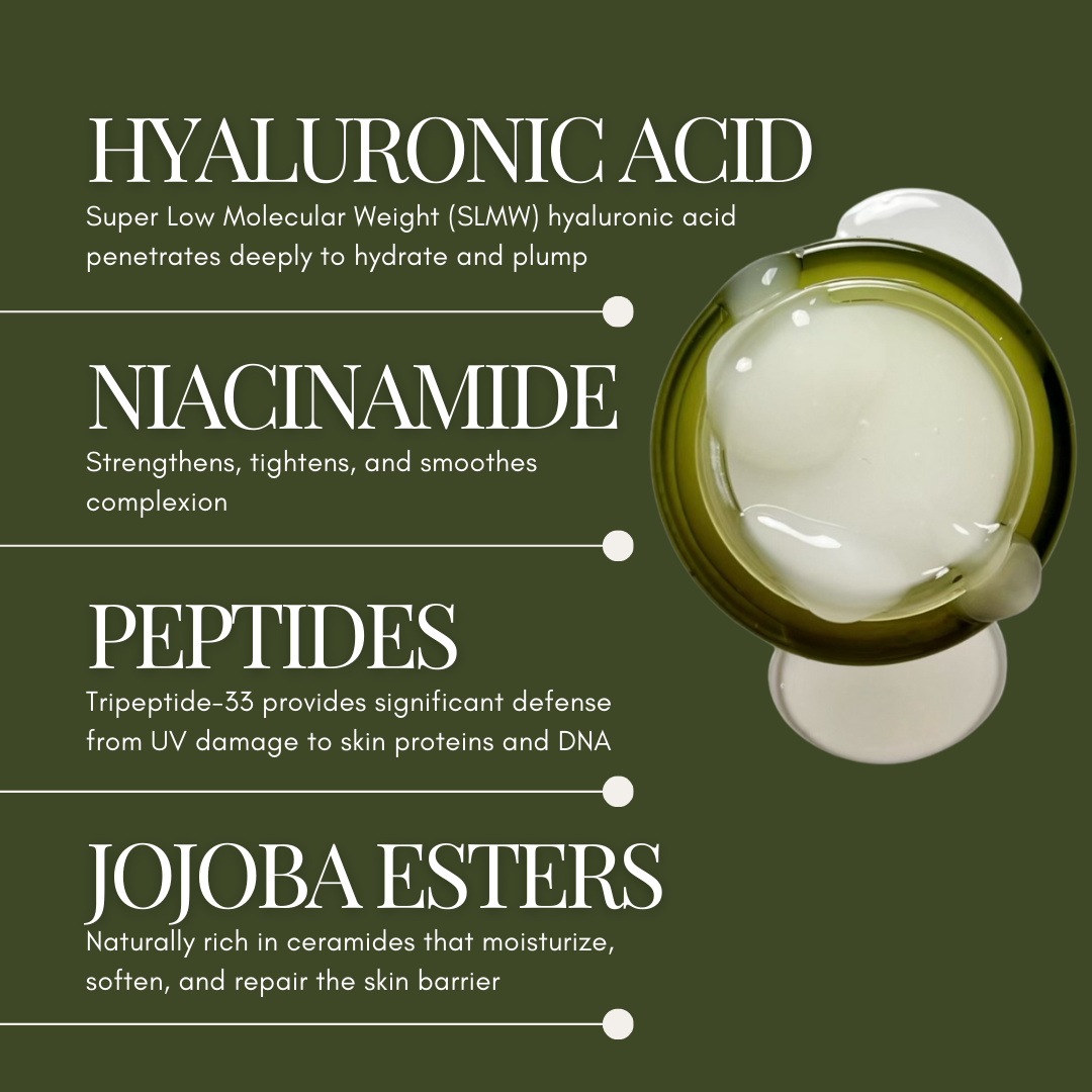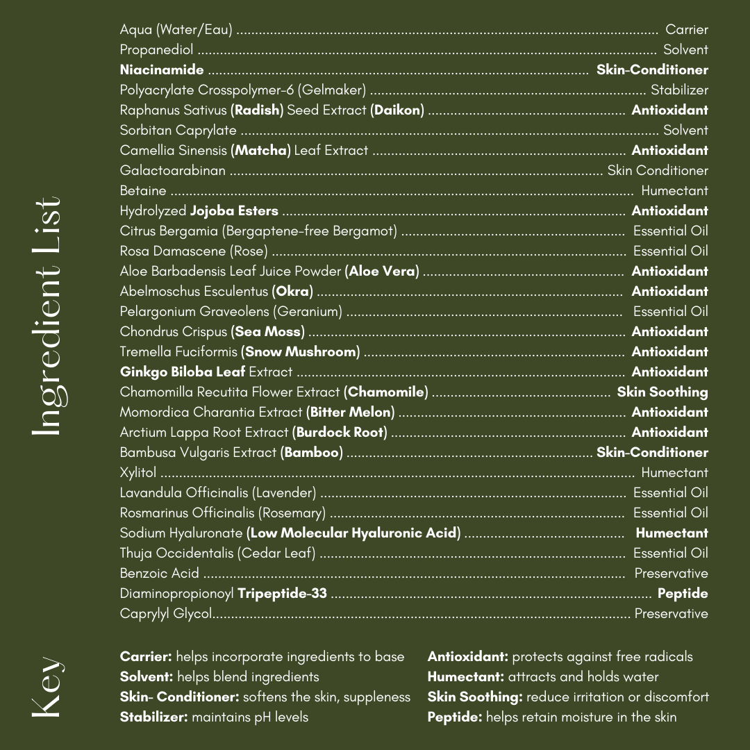 Aqua (Water/Eau), Propanediol, Niacinamide, Polyacrylate Crosspolymer-6 (Gelmaker), Raphanus Sativus (Radish) Seed Extract (Daikon), Sorbitan Caprylate, Camellia Sinensis (Matcha) Leaf Extract, Galactoarabinan, Betaine, Hydrolyzed Jojoba Esters, Aloe Barbadensis Leaf Juice Powder (Aloe Vera), Abelmoschus Esculentus (Okra), Chondrus Crispus (Sea Moss), Tremella Fuciformis (Snow Mushroom), Ginkgo Biloba Leaf Extract, Chamomilla Recutita Flower Extract (Chamomile), Momordica Charantia Extract (Bitter Melon), Arctium Lappa Root Extract (Burdock Root), Bambusa Vulgaris Extract (Bamboo), Xylitol, Sodium Hyaluronate (Hyaluronic Acid), Benzoic Acid, Diaminopropionoyl Tripeptide-33, Caprylyl Glycol
