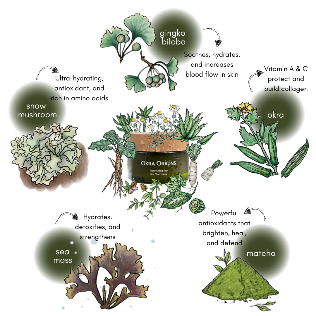 Daikon Seed, Matcha Green Tea Leaf, Aloe Vera, Okra, Sea Moss, Snow Mushroom, Ginkgo Biloba, Bitter Melon, Burdock Root, Bamboo